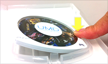 ディスク中心の透明な部分を軽く押しこみ、ケース留め具の爪へ固定させてください。